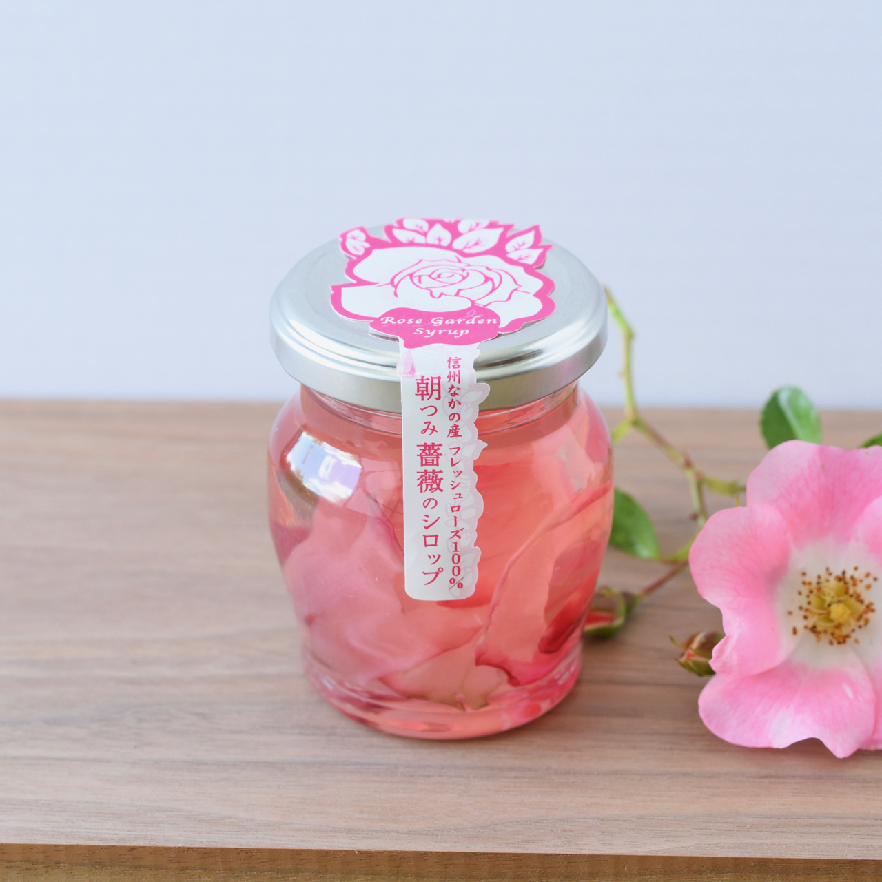 国産原料のみを使用し、バラ生産者・荒井バラ園が地元のワイナリーと連携して作っています。炭酸で割ってサイダーに。デザートのトッピングに。香料・着色料不使用です。