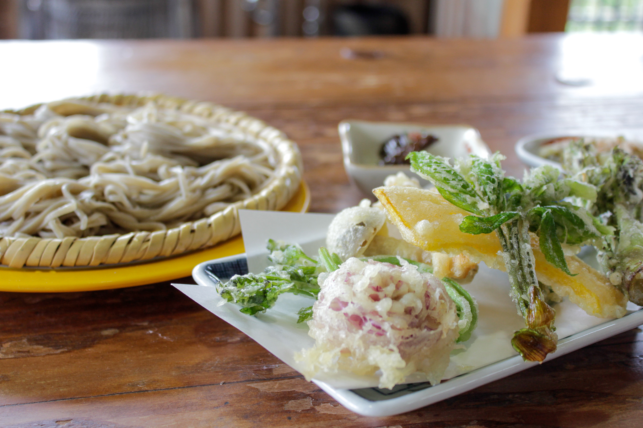 「やまびこしめじ 天ざる」か「山野菜 天ざる」のご注文で、センティッド・ジュエルの天ぷらが付きます。どちらも1,080円で、シャキッとした歯ごたえの富倉そばに、天ぷら盛り合わせと小鉢が付きます。