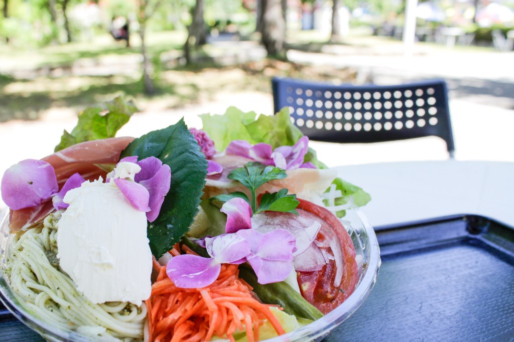 ランチはサラダバーにピザやパスタとのセットで。夜のメニューでもエディブルローズが食べられます。