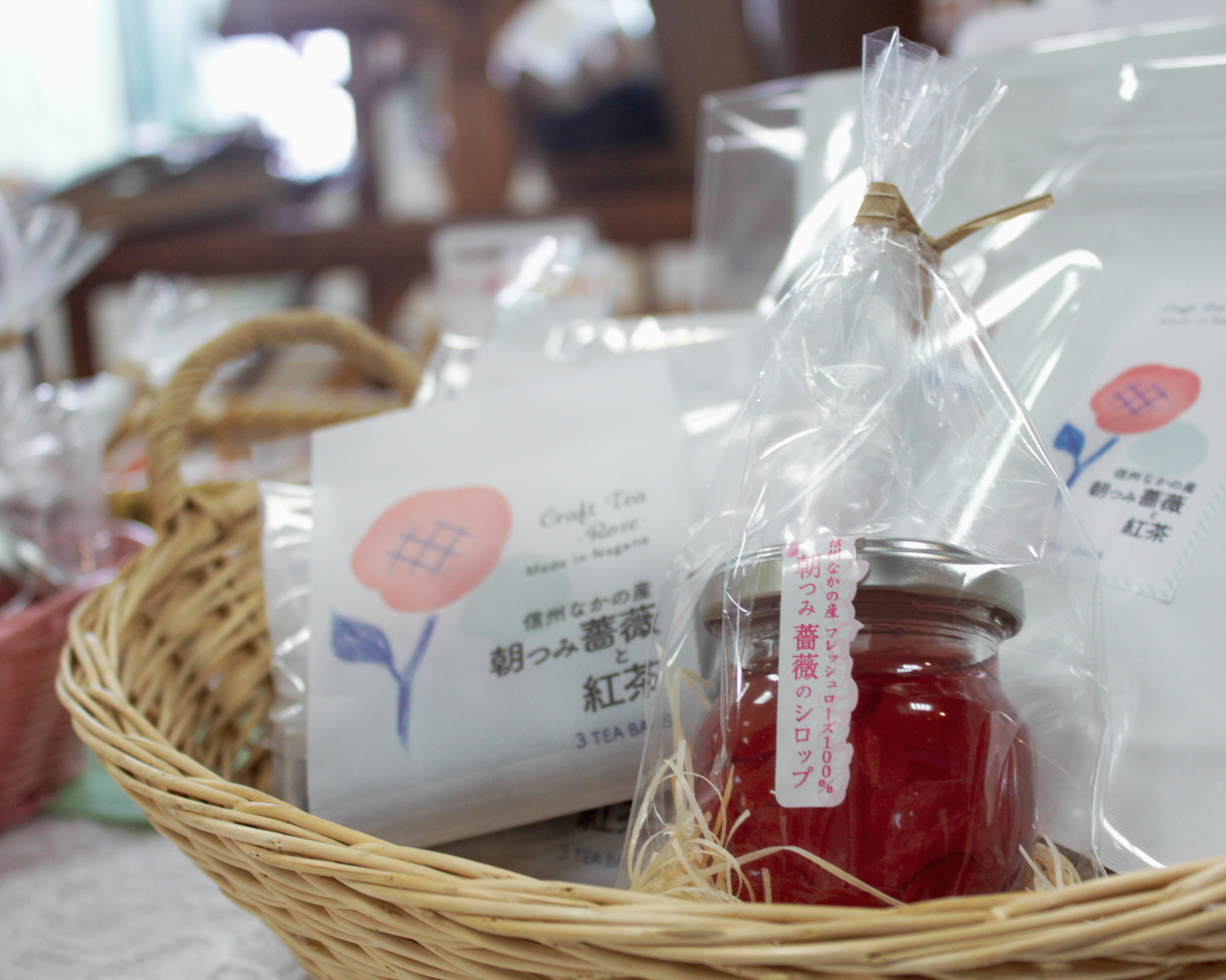 中野陣屋・県庁記念館では、丸屋製菓舗さんの薔薇サブレのほか、おいしいばらプロジェクトの「朝つみ薔薇のシロップ」や「朝つみ薔薇と紅茶」といった、中野市産エディブルローズを使った加工品を販売しています。