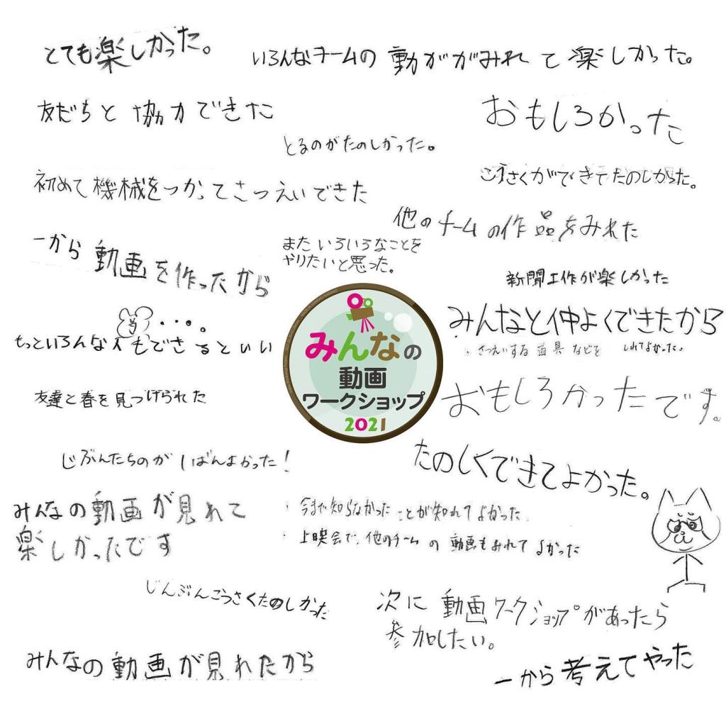 - 素晴らしい企画でした。上映会もとっても楽しかったです。メイキングがあり、当日の様子がよくわかり、作品への理解も深まりました。自分たちで動画を作り上げる過程で、プロの方の仕事がいかにすごいことなのかを感じられたようです。自分たちも力をあわせて完成させられたのは自信につながったと思います。