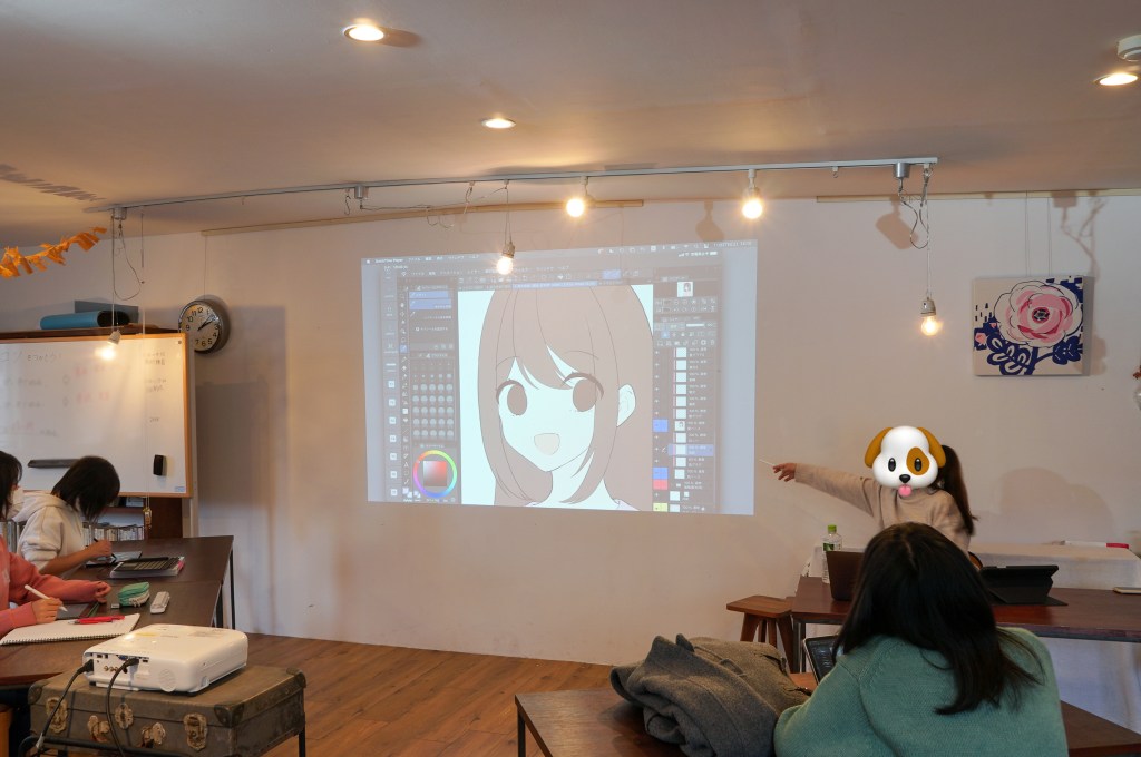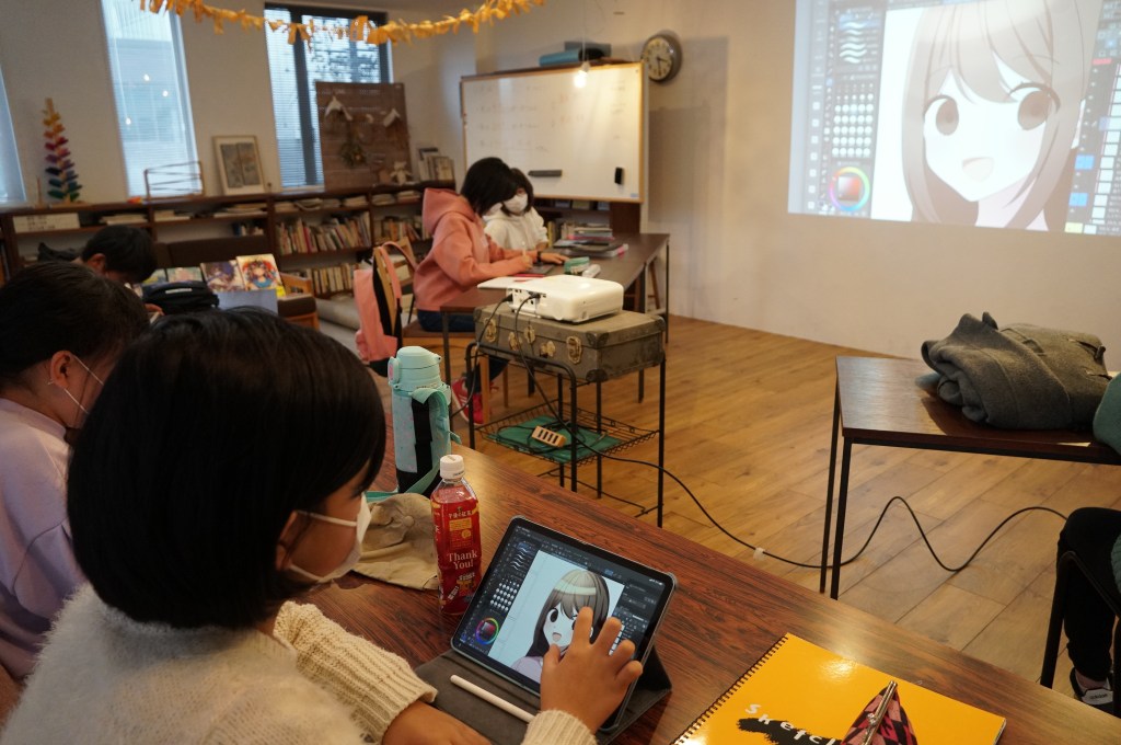 今回は、アプリ「クリスタ」のデータをはるの先生に用意していただき、下絵と色(カラーパレット)を全員の端末に配布。それをもとに一緒に課題制作を行いました。