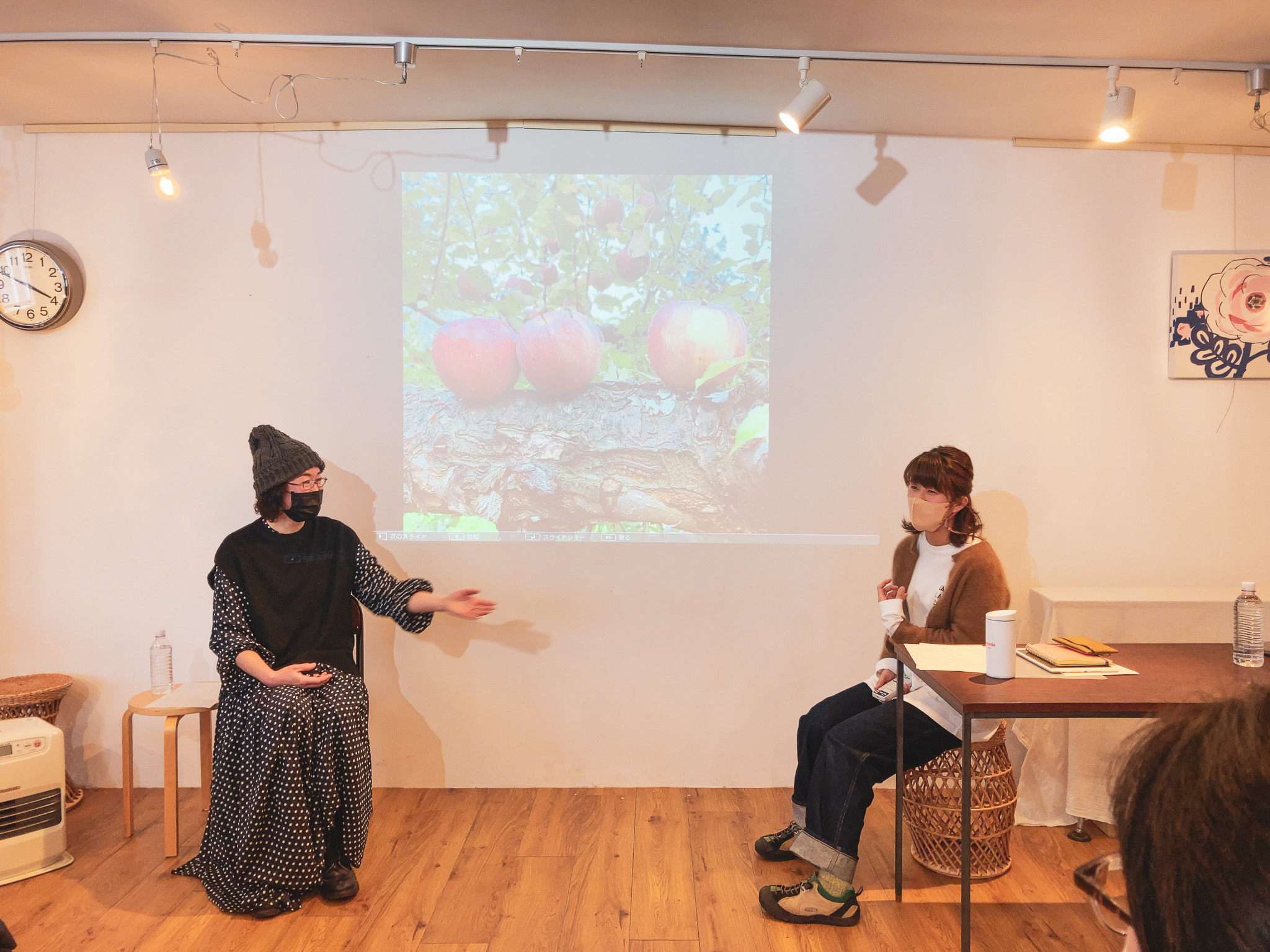9/11に開催したVol.3のゲストは、まつじるし農園の松野奈月さん、荒井バラ園の荒井綾さん、そして藤森由衣さんの3人。今回のテーマは「中野市で農家になってみた 〜移住、子育て、農ある暮らし〜」。コロナの影響からオンラインのみでの開催となってしまいましたが、ゲストのみなさんが持ってきてくださった新鮮なカボチャやバラ、加工品を囲んで、女性4人がざっくばらんにおしゃべりする楽しい時間となりました。トークのあとには、Zoomでつながった参加者さんとの交流タイム。オンラインならではの関わり方を楽しむことができました。