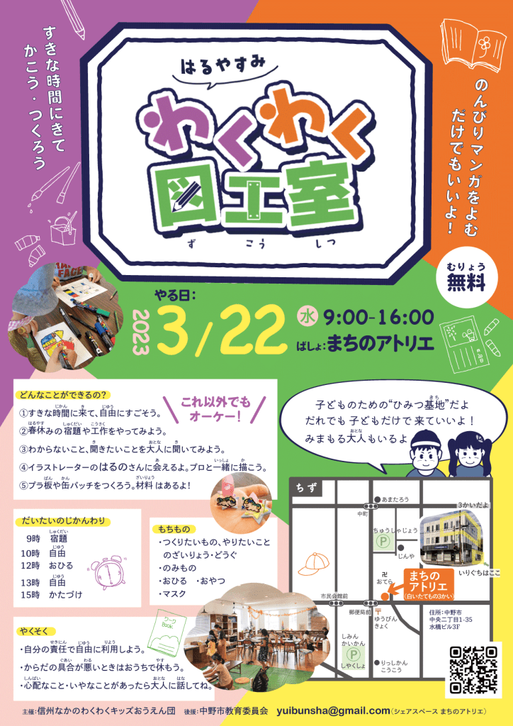 中野市の文化資源を活用したイベントやワークショップを企画・運営してきた「コワーキング&シェアスペース まちのアトリエ」は、中野市の子どもたちとクリエイターがふれあうコミュニティ「はるやすみ わくわく図工室」を開催します。