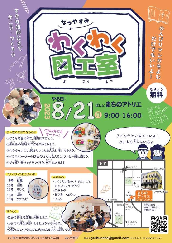 中野市の文化資源を活用したイベントやワークショップを企画・運営してきた「コワーキング&シェアスペース まちのアトリエ」は、中野市の子どもたちとクリエイターがふれあうコミュニティ「はるやすみ わくわく図工室」を開催します。
