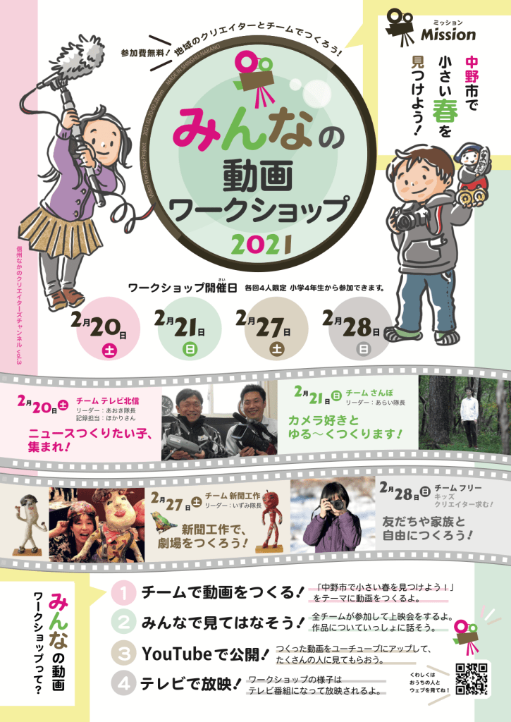 中野市で活躍するクリエイターと子どもたちが交流しながら、動画制作を通じてゆるやかにつながる映像ワークショップです。子どもたちと一緒に、映像を受信するだけではなく、創造し発信することの楽しさを体験したいと思います。